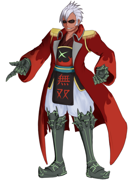 逆立った銀髪にサングラス、楼蘭式軽装鎧の上から赤いロングコートを着こむという異形のいでたちをしている。
