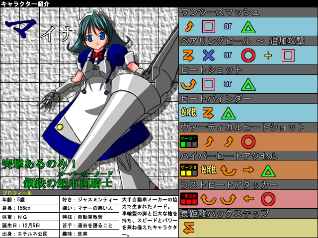 吹き飛ばし系と突進系の技が多くコンボは軒並み高難度だが、極めればか弱い相手ならワンセットで気絶に追い込むことも。