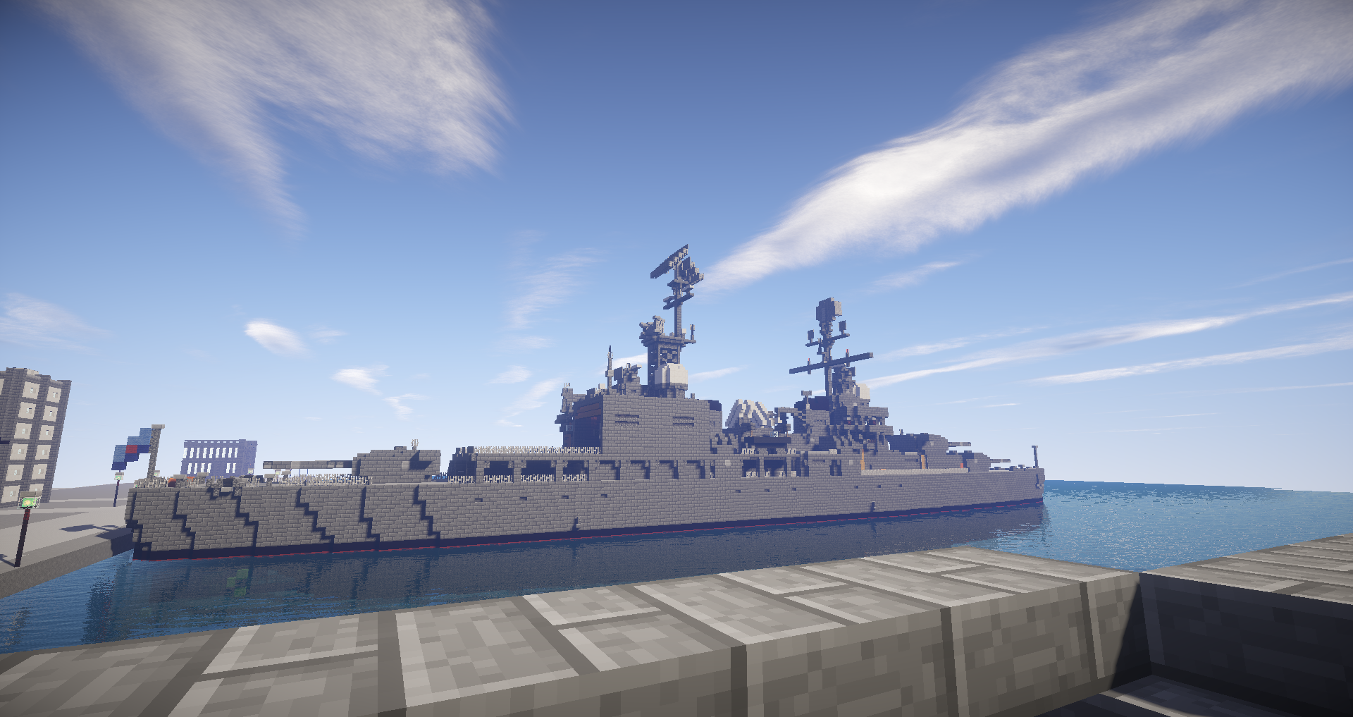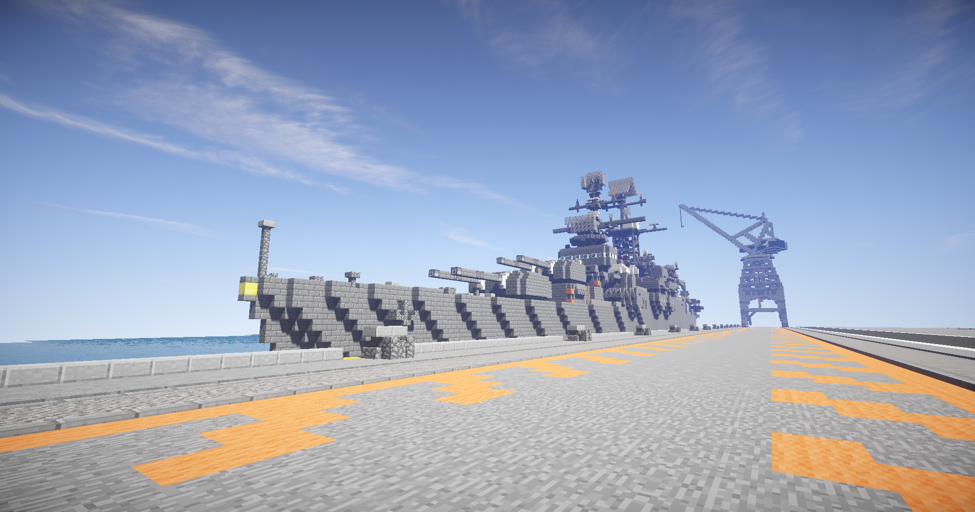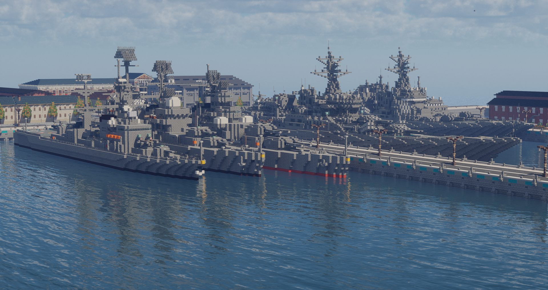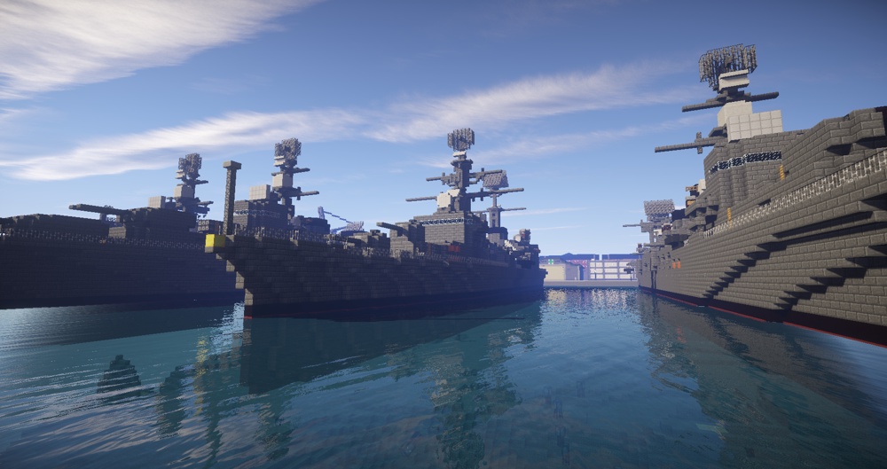 セントラル=オストリカ海軍基地に停泊する朝日皇国親善艦隊。写真左側奥から大型巡洋艦あおば(第13戦隊旗艦)・軽巡洋艦おおよど・駆逐艦しらなみ。