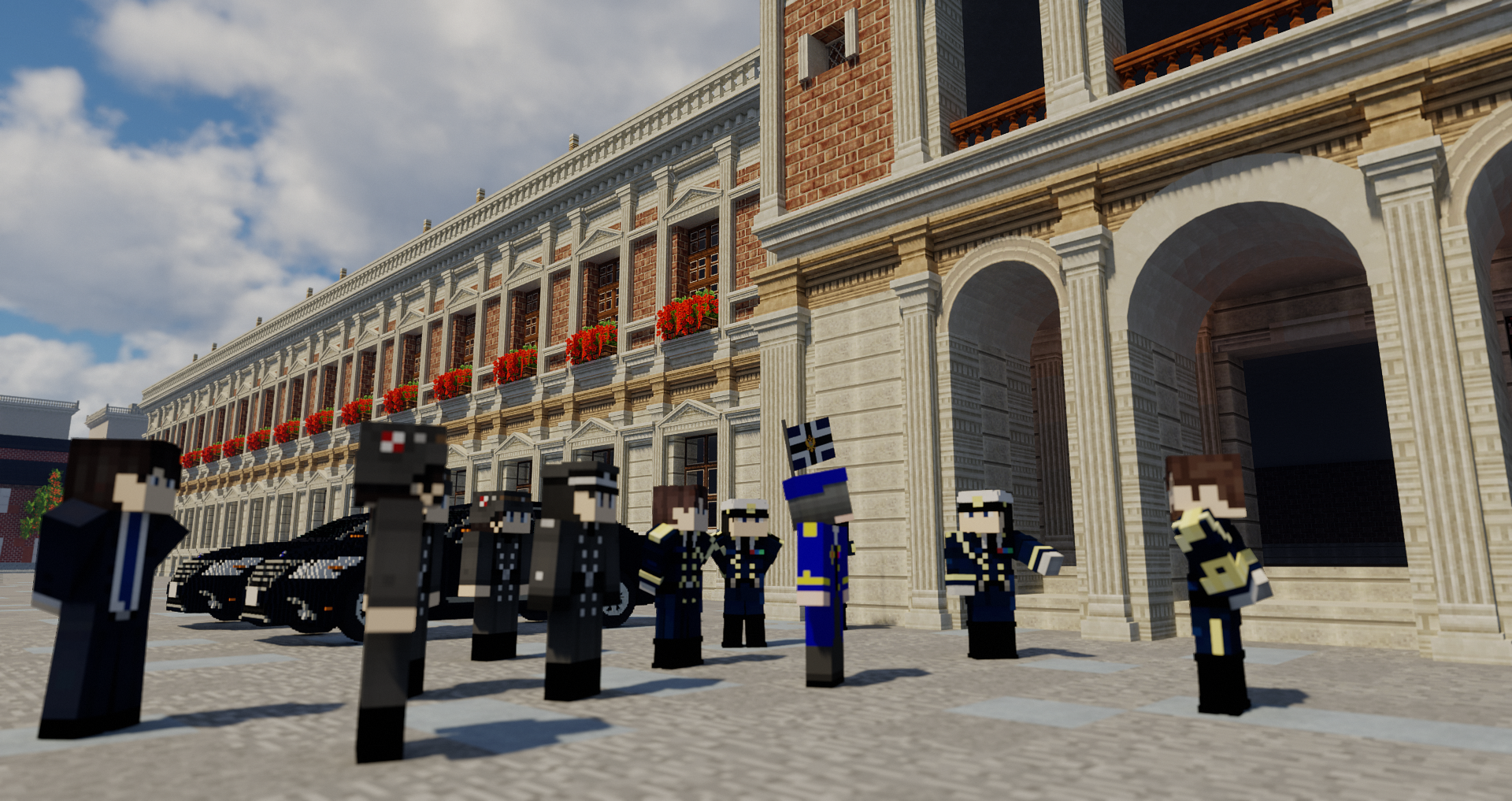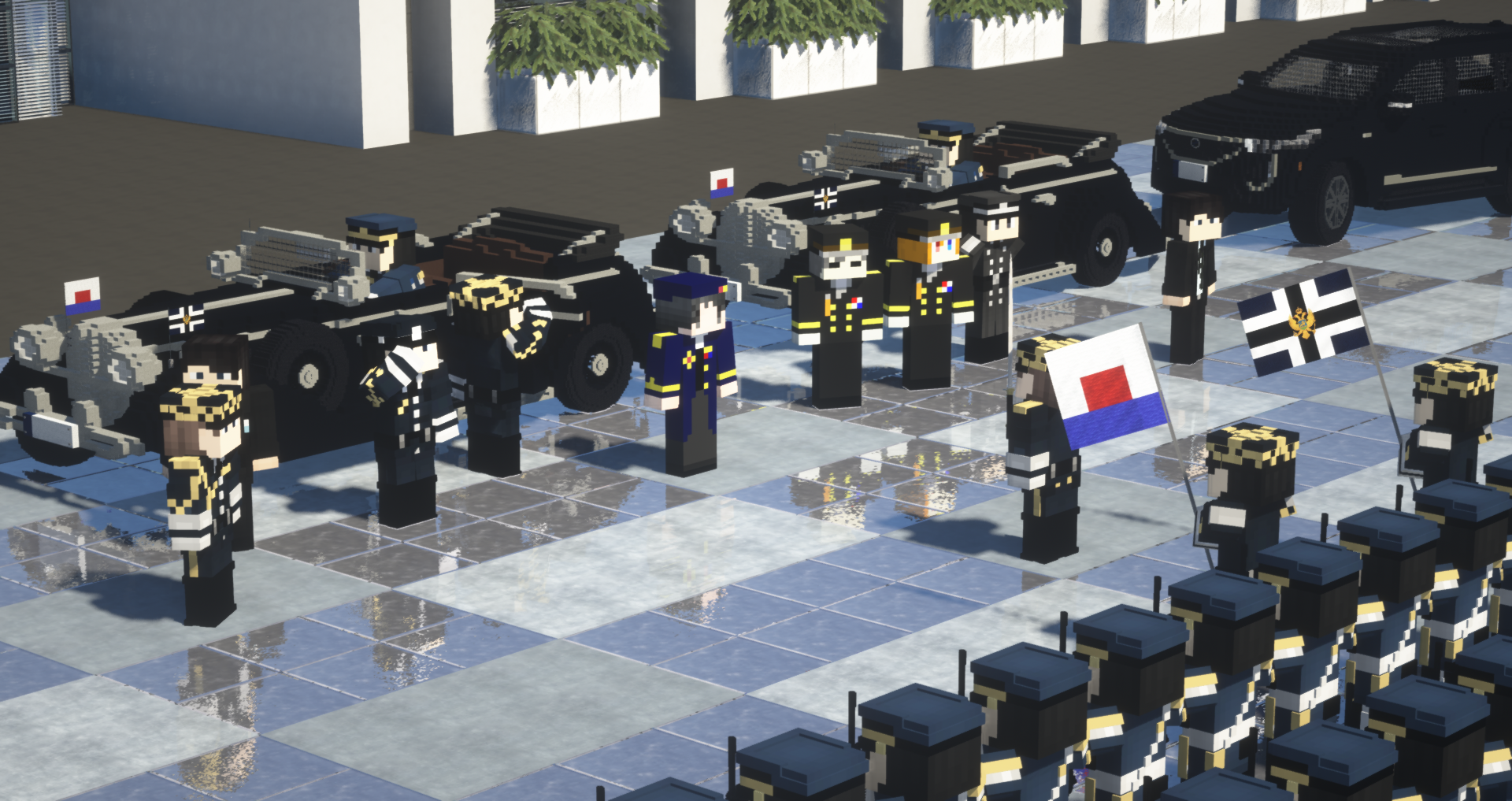 シークヴァルドアストリア聖国の儀仗隊から歓迎を受ける秋葉皇子と親善艦隊、第1近衛戦隊・第13戦隊の天城(第1近衛戦隊司令)・物部(第13戦隊司令)両海軍少将。後ろには護衛の朝日皇国近衛兵団の将校が佇む。
