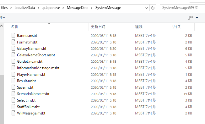 先ほど解凍したSystemMessageのフォルダを開いてください、するとこんな感じのMSBTファイルがずらりと並んでいるはずです。