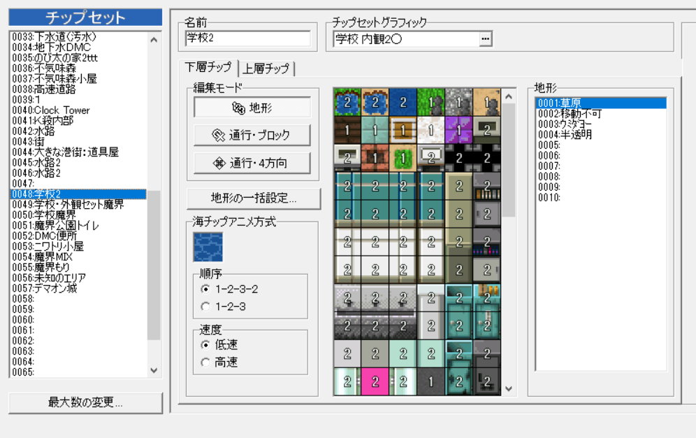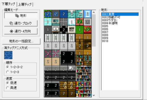 上層チップを使うときも、この地形IDの注意が必要で、進入不可能な上層チップの下には、必ず地形ID2の床を置くようにしてください。