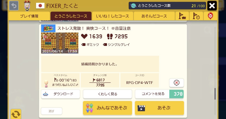 ちなみに最も伸びたコースは「ストレス発散!爽快コース」というコースであり1000いいねを越している。遊んだ人が9000人ということは9人に1人がいいねしていることになる。めっちゃ多い。