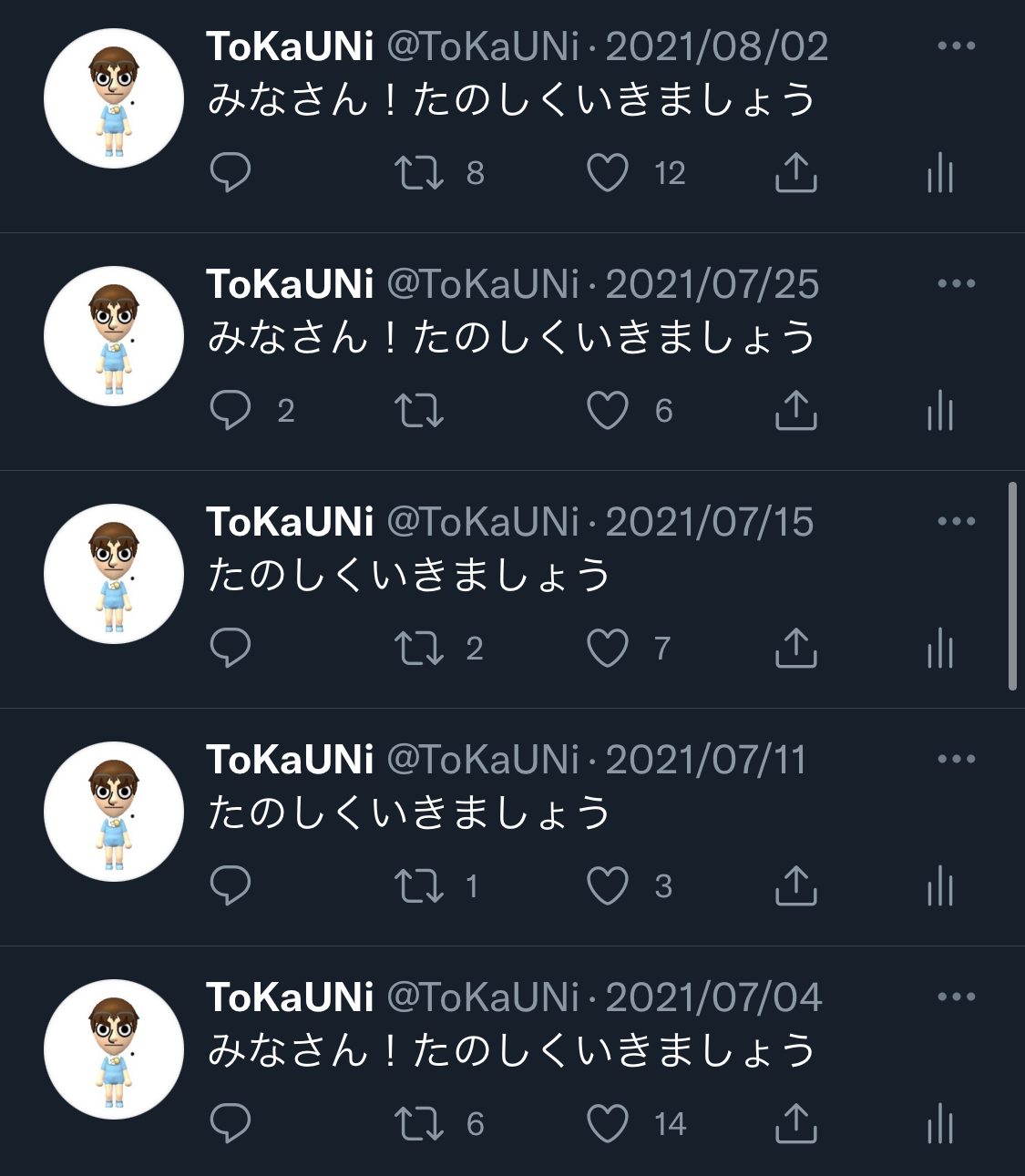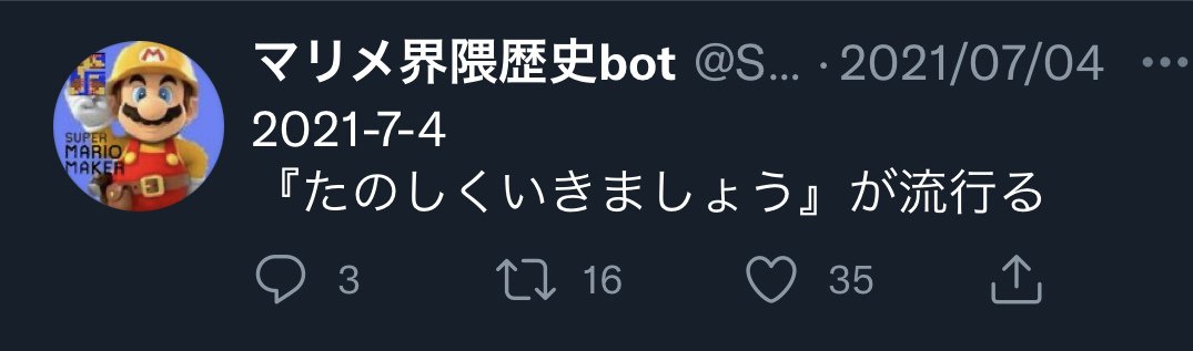 2021年7月4日に多くのマリメ勢が「たのしくいきましょう」という文をほぼ一斉にツイートしたため、マリメ界隈歴史botに載ったようだ。