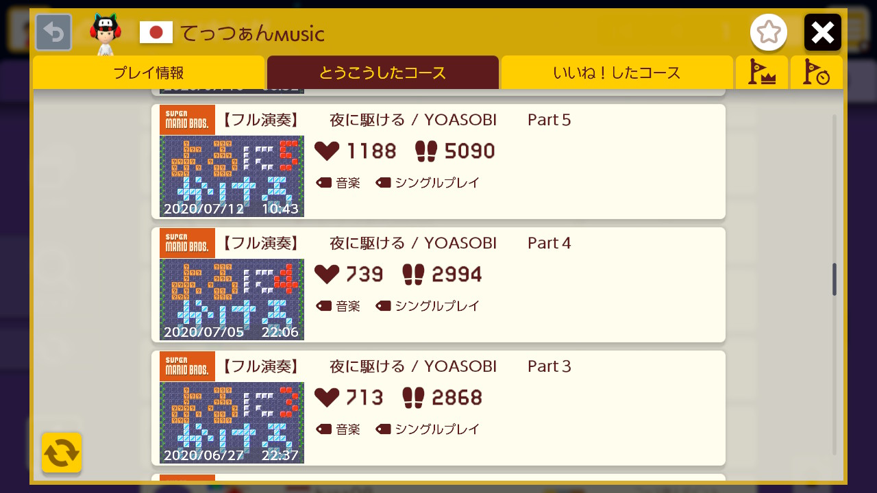 マリオメーカーで投稿しているコースには単品の演奏コースが多いが、てっつあん氏の