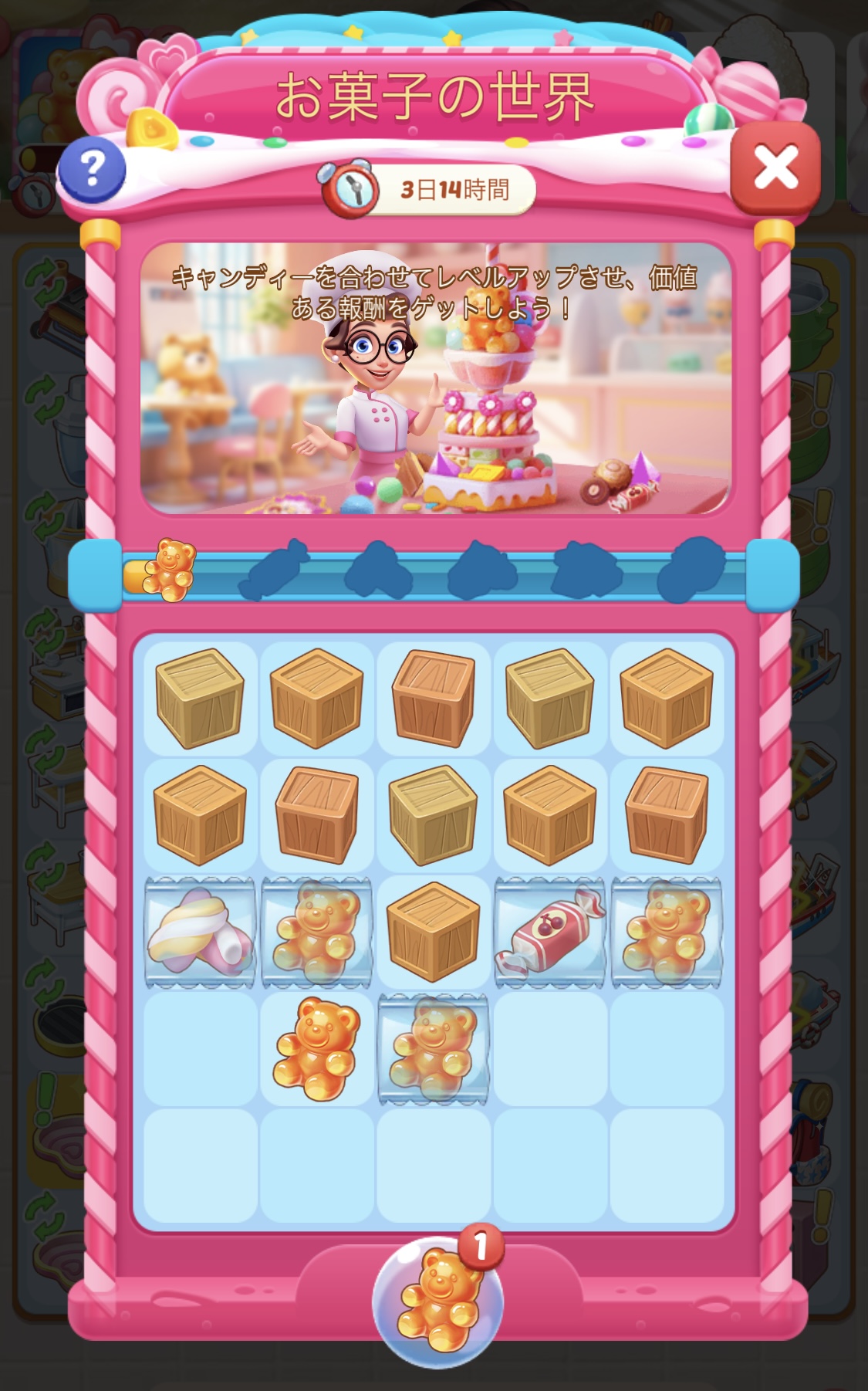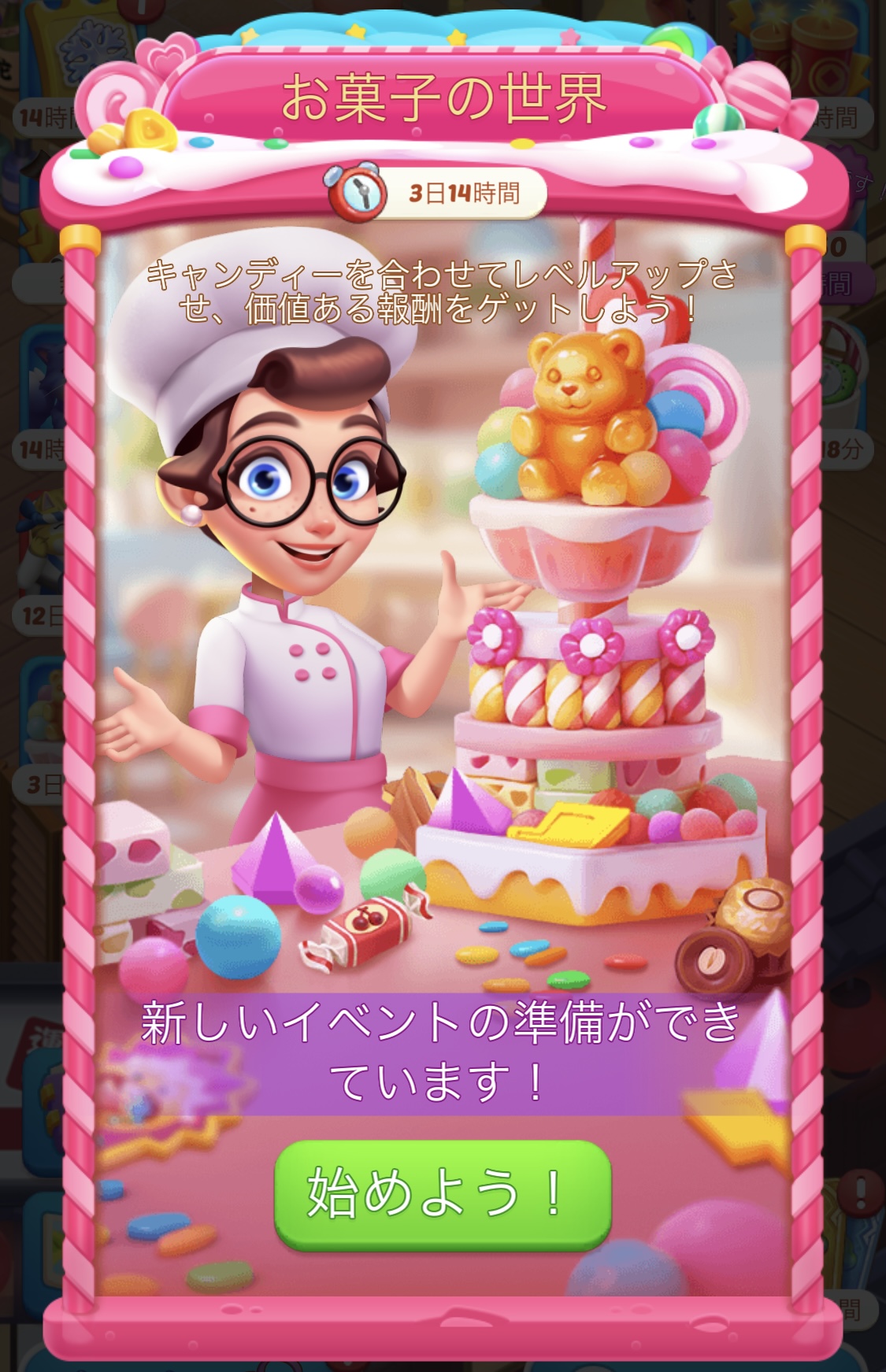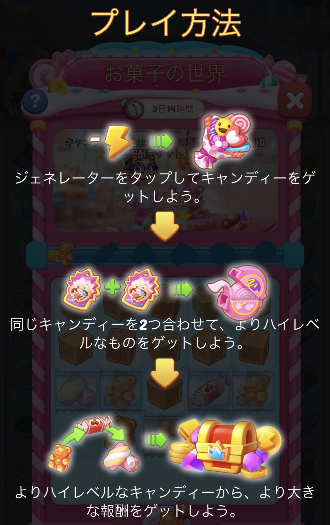 ②集めたキャンディーをお菓子の世界モードでマージしてレベルアップさせる