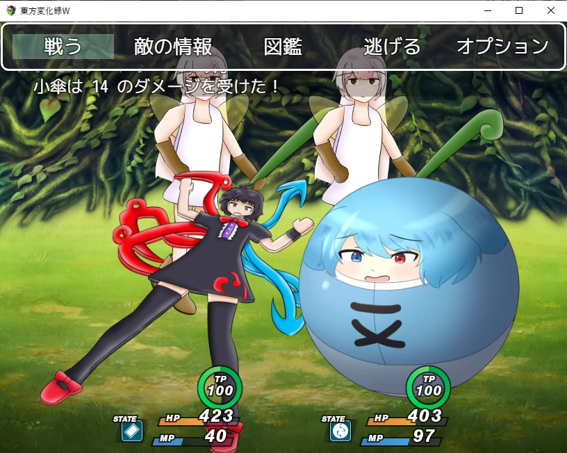 本作はぬえと小傘の二人旅を軸としたターン制バトルが採用されている。