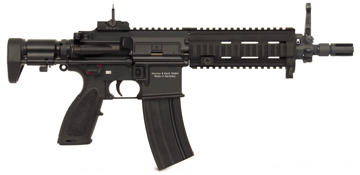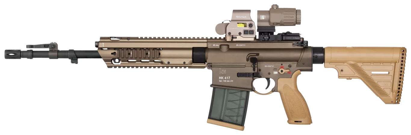 M4A1をデルタフォースの要望に合わせ、砂漠や沼地などの過酷な環境でも確実に作動できるようにショートストロークガスピストン方式に変更したもの。主にデルタフォース、DEVGRU等そういう環境で活動する特殊部隊で使用される。M4で使われるダイレクトガスインピンジメント方式は発射ガスをガスチューブで運び、ボルトに噴射した際の圧力で動くため、ガスチューブとボルト周辺が汚れやすいため耐久性が低く、整備回数を増やさなければなりません。それに対してHK416は、発射ガス圧を利用してバレル上部の独立したピストンを動かし、それでボルトを叩いた慣性で動かすため、ボルトが汚れにくく、耐久性に優れているので整備回数を少なくできます。他にも耐久性を高めるために冷間鍛造バレルといって、ライフリングを刻む際にバレルを叩く、いわゆる日本刀に近い作り方をしたことにより、とても頑丈なバレルとなっています。外観の特徴で言うと、ガスピストンを搭載するために高くなったレシーバーとハンドガードが特徴。因みにハンドガードはフリーフローティングのため、外部の影響を受けにくく、命中精度が高いそうです。