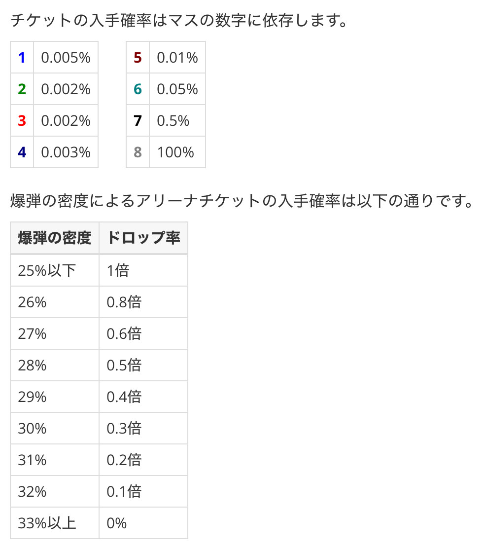 表は爆弾密度が高くなるとドロップ率が低くなることが書いてあります。意図的に高レベルのチケットを稼ぐのを防ぐための調整ですが、高難度盤面でも30%超えのものは数少ないので気にしなくてよいでしょう。