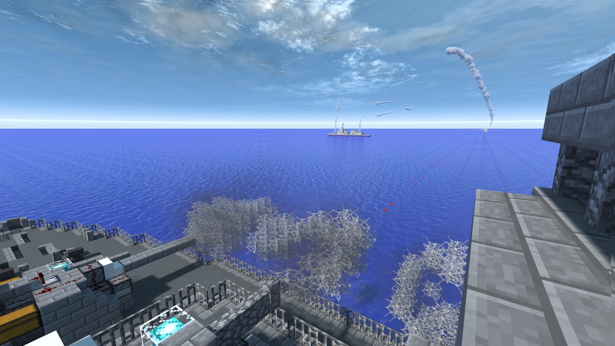 ↑防空戦闘を行うジョウト級駆逐艦ジョウト。全力で応戦するモーリンバロタ艦も写り込んでいる。尚、本艦が迎撃している敵誘導弾は本写真の撮影直後に迎撃されている。
