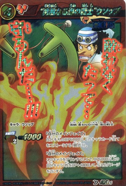 『自分のメインフェイズ』 自分手札のBP6000以上のキャラカード全てをコスト-3する(最低1) 『自分のメインフェイズ』 このキャラをダウンすることで、BP6000以上の自分キャラ1枚をBP+4000して、与えるダメージを2にする。 |