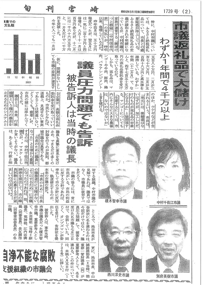 次の疑惑として、返礼品を扱う「株式会社 ぽけっと都城」、代表者はなんと「市議会議員 中村千佐江」の夫である。