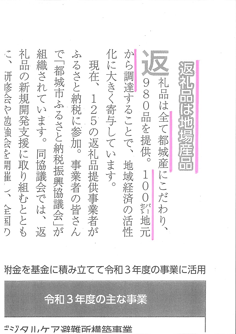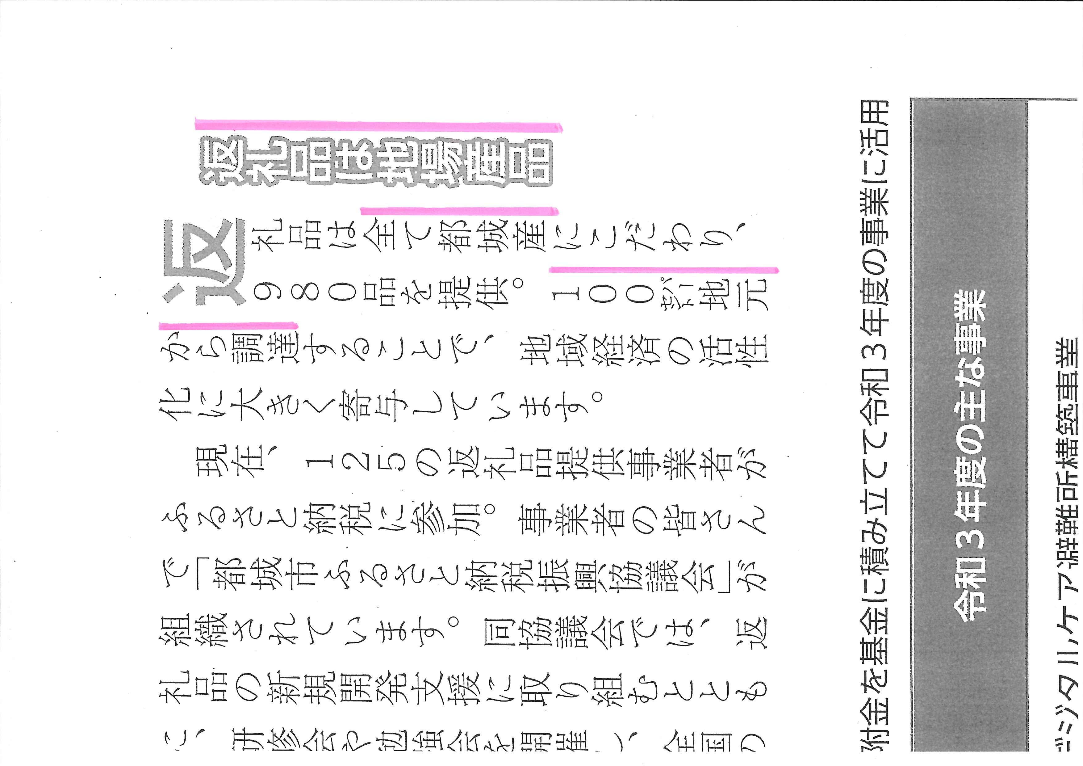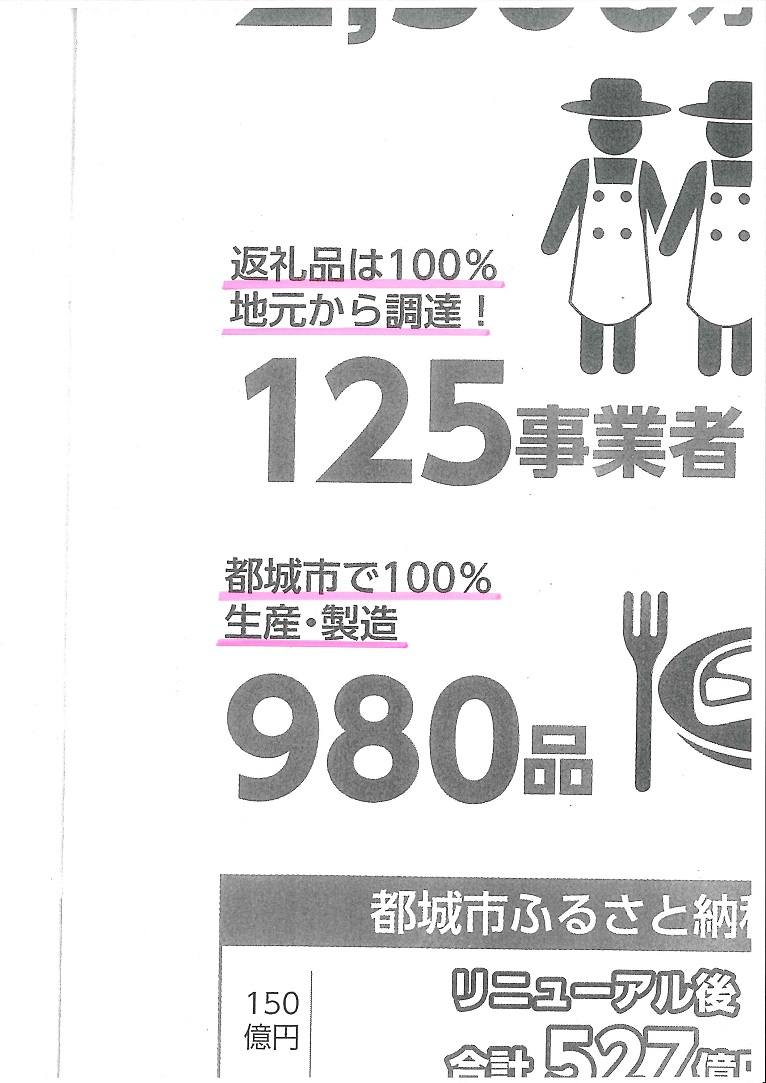 また、広報都城9月号では、都城市は、返礼品は100%地元から調達。都城市で100%生産・製造。返礼品は地場産品。全て都城産。100パーセント地元から調達。と記事掲載されています。