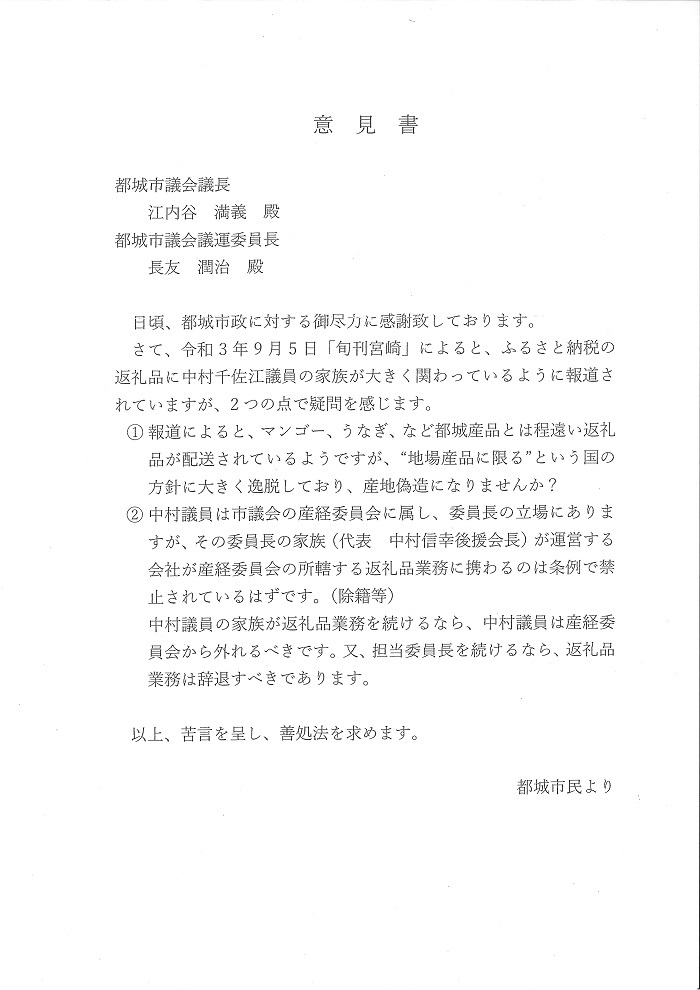 ふるさと納税返礼品疑惑の解明を都城市長及び市議会が怠る場合には、行政監査不服申し立ても視野に入れなければなるまい。