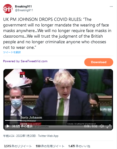 英国首相ジョンソンはコロナ規則を破棄します:「政府はもはやどこでもフェイスマスクの着用を義務付けません...私たちはもはや教室でフェイスマスクを必要としません...私たちは英国の人々の判断を信頼し、もはやマスクを着用しないことを選択した人を犯罪者とはみなさない。」