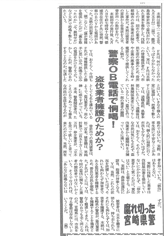 Y氏は、県警本部退職後、林業関係者業者に天下りしているらしいが、先に述べてとおり、元警察官としての使命を忘れ、腐れ切った人間である。
