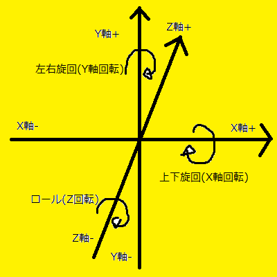 上を向くとx軸回転+、右を向くとY軸回転+、首を右に傾げるとZ軸回転+。