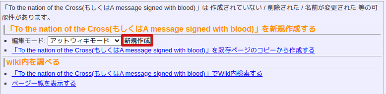 一・左上から「新規ページ作成」をクリック。編集モードはアットウィキモードを選択。ページ名には該当する単語のみを記してください。
