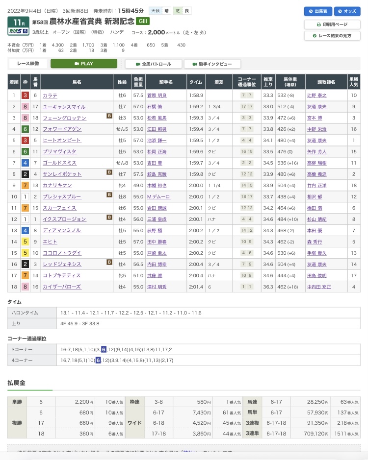 勝ち馬のカラテはマイル戦を中心に使われており、スタミナ面で不安視され、10番人気と競馬ファンからは全く指示されなかったけど