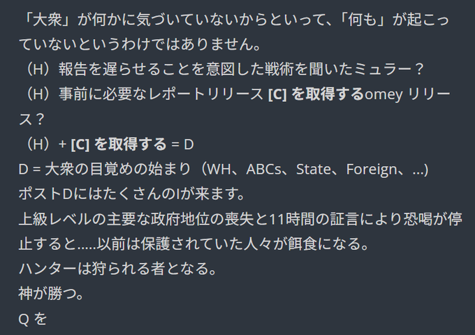 「ホロウィッツ→コミー→FISA→大量起訴」についても5000近くあるQドロップを読みこなせば見えてくる話だが、日本人には、これ英語であるのと暗号が沢山あるので「ほとんど」がこれを読もうとしない。