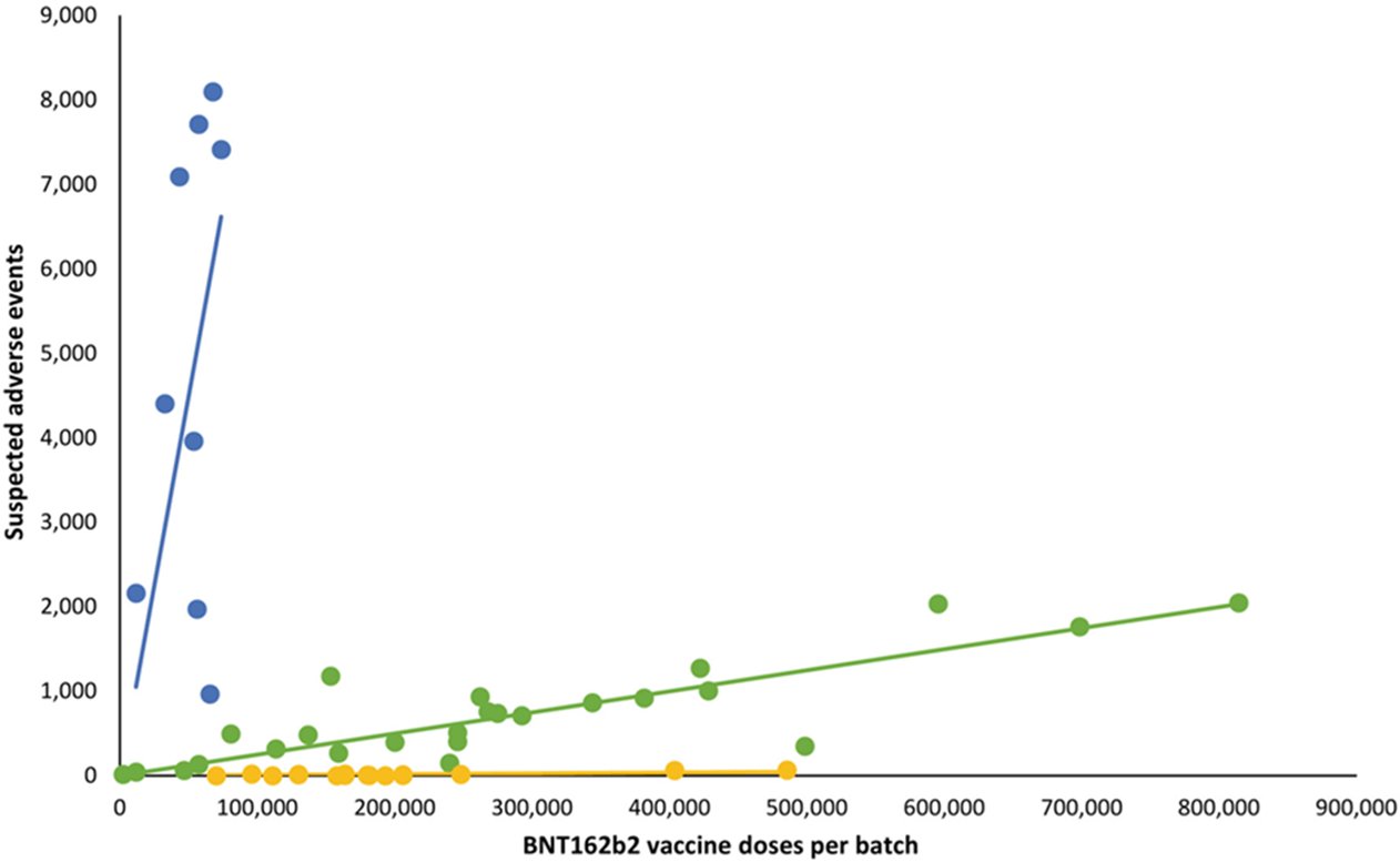 デンマーク(人口580万人)で2020年12月27日から2022年1月11日までに接種されたコロナワクチンについて、それぞれのロットで副反応の発生数を調べた。