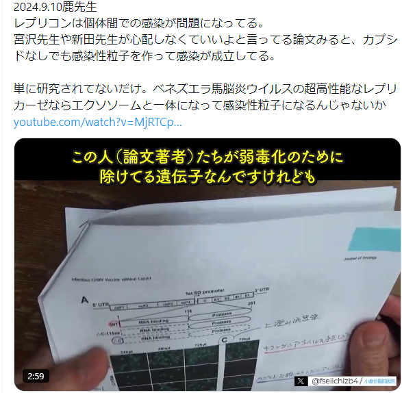 感染性粒子を作り、異常に増幅しやすいベネズエラ馬脳炎のレプリカ―ゼは、ワクチン研究者ならば誰も実験したい。だから鹿先生のこの話も本当は少し違うのだ。鹿先生の言うように単に研究されてないだけ、ではなく、研究はそこそこされているが、単なる失敗だらけで、論文なっていないだけなのである⬇