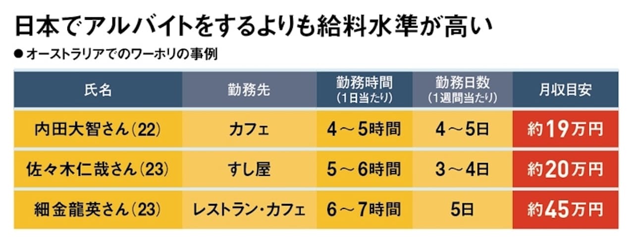 好待遇の理由の一つは最低賃金の高さにある。東京の最低賃金が時給1113円なのに対して、豪州は同約23豪ドル(約2250円)。円換算すると以前から豪州のほうが高かったが、為替レートが今では1豪ドル=約98円と、新型コロナウイルス禍を挟んだ約4年間で3割近く円安に振れたことで、その差は2倍にも広がった。