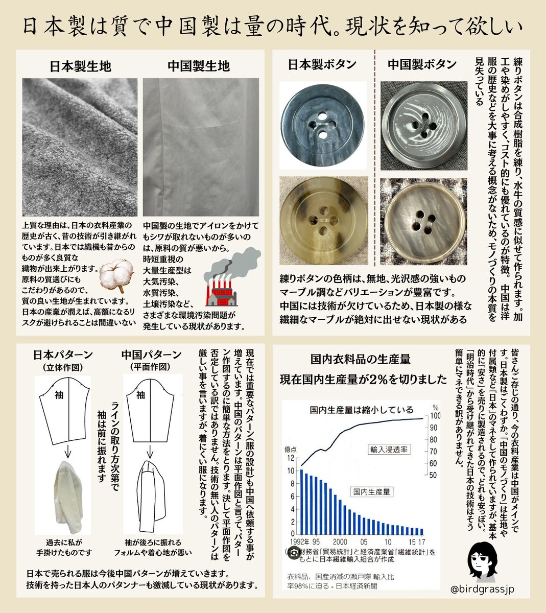 - 現代では、日本の縫製工場は正直に言うと厳しい現状にあり、国内生産量が2%を切っている
