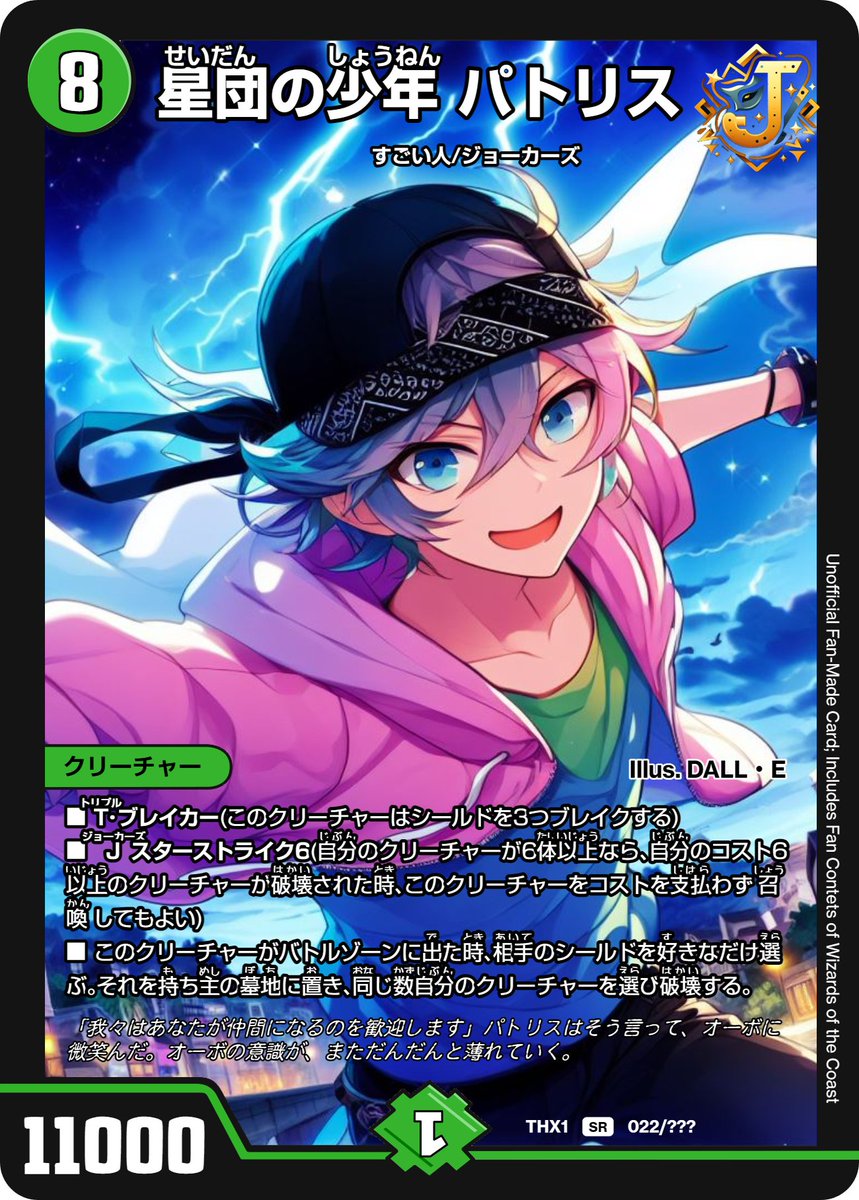 黒い帽子を逆向きに被った少年で、青・紫・金の髪。ピンク色のジャケットを着用している。
