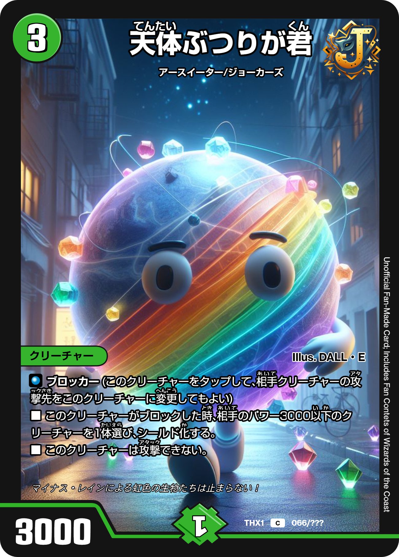 地球をモチーフにしたゆるキャラかマスコットのような見た目で、丸い目と手足がある。体はたすきみたいに斜めに虹色のラインが入っている。またその周囲をさまざまな色の結晶(《マイナス・レイン》の一部)が付着・浮遊している。