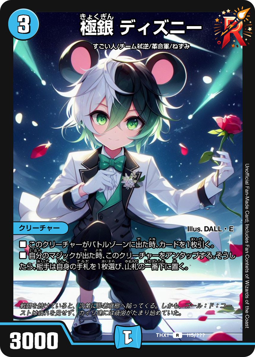 《『冬栄』 ディズニー》が革命軍となった姿。服装はジャケットに首ヘッドホンというラフな物から、白を基調としたタキシードへと変化し、クールな雰囲気も纏っている。しかも赤い薔薇を持っているので、もしかしたら悲劇のお姫様を救いに行ったのかもしれない。