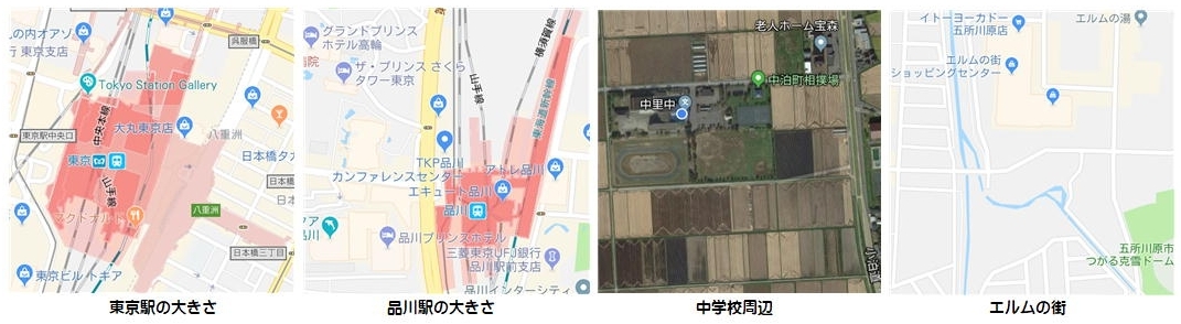 東京駅・品川駅・学校・エルムの街の大きさ比較