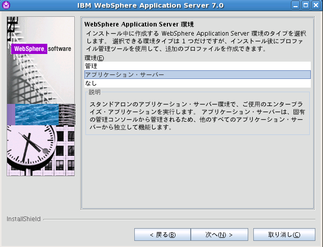 - プロファイルを選択。環境「アプリケーションサーバ」のプロファイルが1個配備されている。