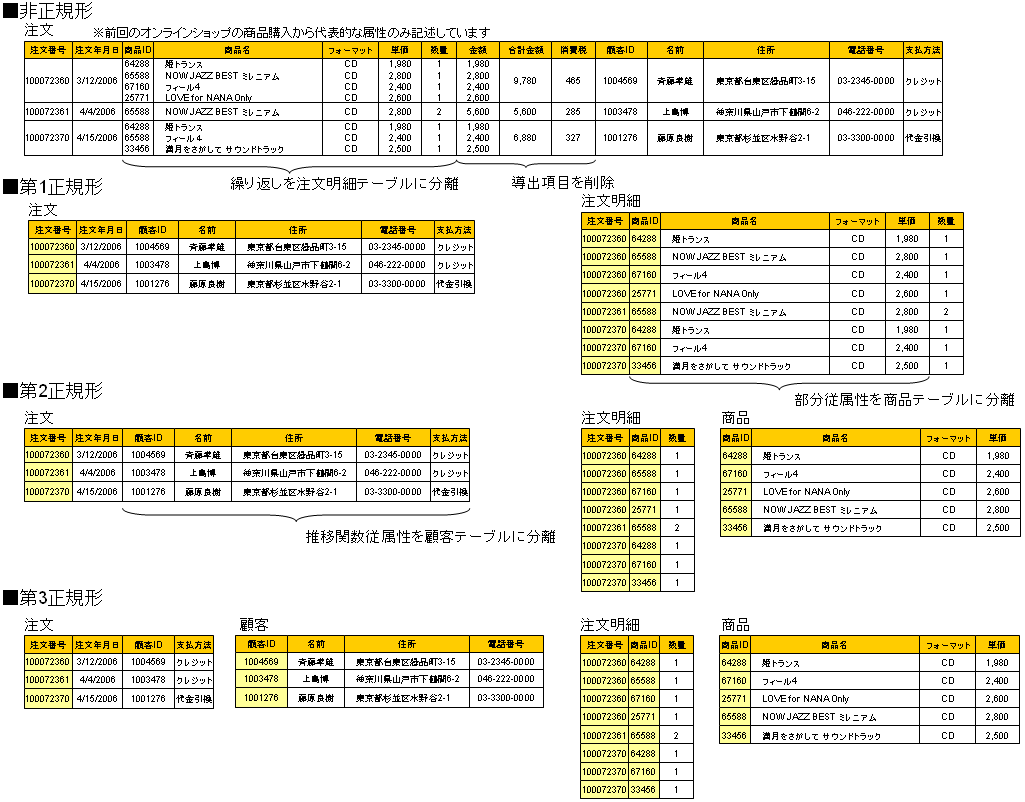 注)推移関数従属性とは、Aが決まるとBが決まり、その結果Cが決まるという関係で「A→B→C」(ただしB→Aは不成立)と表記する。B→Cは非キーから非キーへの推移。下図の第2正規系では、顧客IDと名前~電話番号にあたる。
