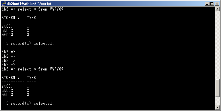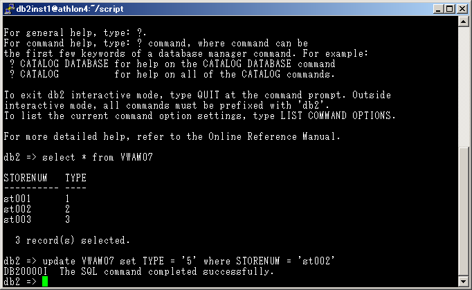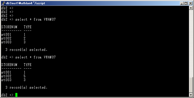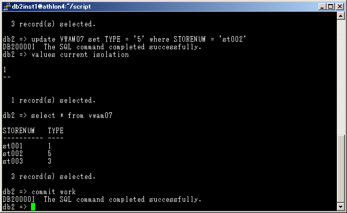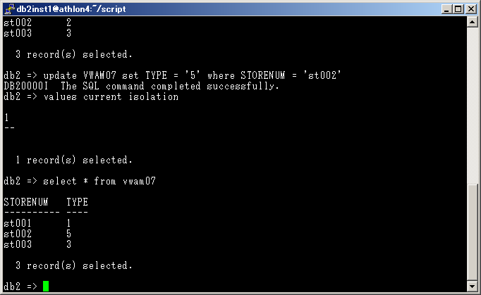 端末2でselectすると、typeは2のまま。commitしていないため、dirty readを防いでいる。 select * from VWAM07 with urを実行すると、typeは5になる。