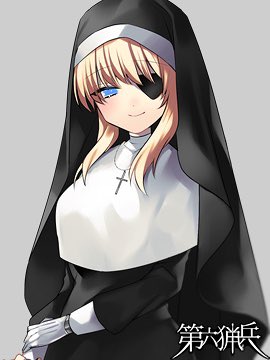 シスター服を着る理由は、最近出撃にドクターストップがかかる機会が増えており、その間平和について祈りを捧げようと思ったから。しかし、故郷の教会はすでに焼け落ちており、その際に教会関係者も軒並み死亡しているため、実質はコスプレとなっている。形から入る気質なのだろう。