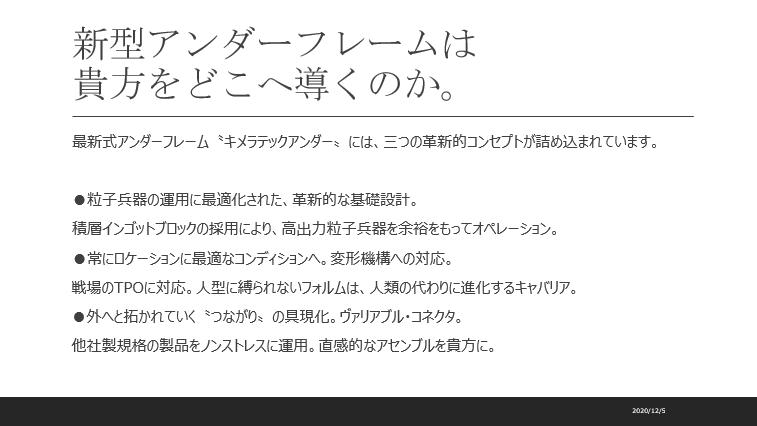 新開発されたアンダーフレーム「キメラテックアンダー」は関節構造とEPバイオニューロンの採用によって高い柔軟性と運動性、そして最大の特徴「変形機能」を有しており、新素材「積層インゴットブロック」からなる稼働時間延長、剛性も併せ持つ。