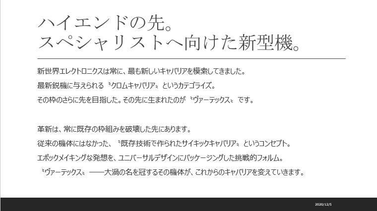 ヴァーテックスは今後展開されていくV.ERT-EXシリーズのひな型と言える機体であり、今後は本機をベースとした特化機のリリースも予定されている。