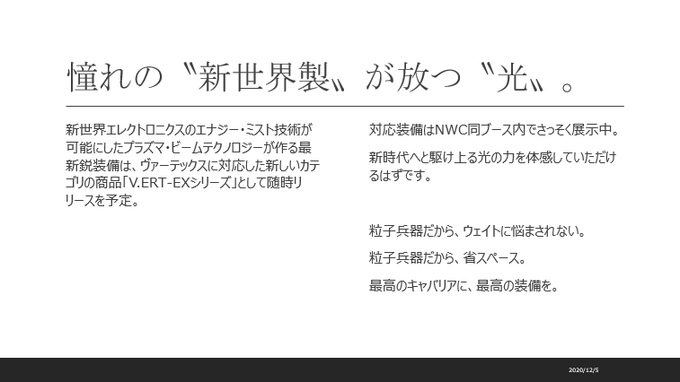 粒子兵装をメインにした新商品の展示ブースと、既製品の電子カタログ。