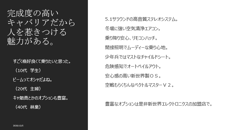 そして非常にアカデミックで未来を感じる新型キャバリアのPVが大スクリーンで流れている。