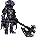 戦闘時には、全身を覆う黒色の甲冑を着用したまさしく悪魔のような姿になり、巨大な