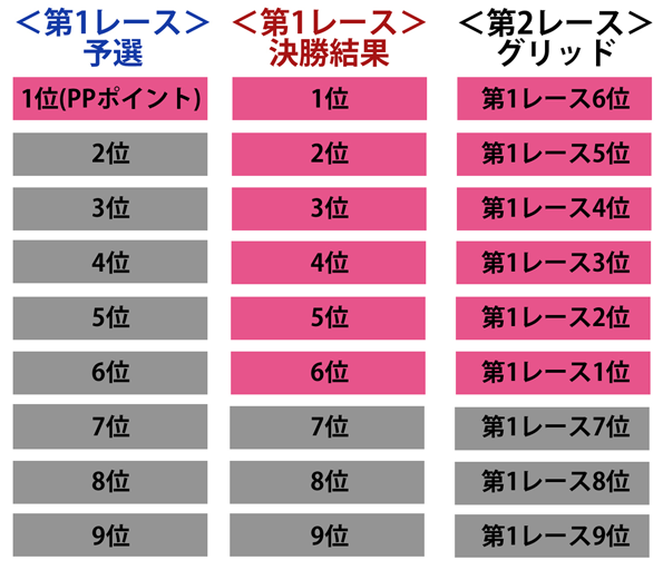●前レース6位以内のチームが翌レースで欠場しても、前レース7位以下のチームが繰り上がってリバースグリッドの対象とはならず、そのまま欠場分を詰める形でレースを行う。