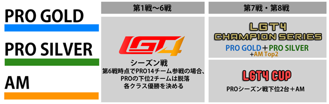 総合チャンピオンを決めるCHAMPIONシリーズについてはPRO GOLDとPRO SILVER(第6戦時点での出場数が上限の場合はPRO SILVERのシリーズランキング下位2台が脱落)、AMの上位2台が争う。