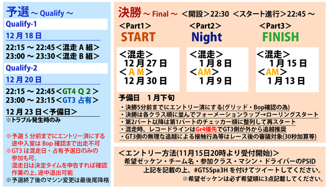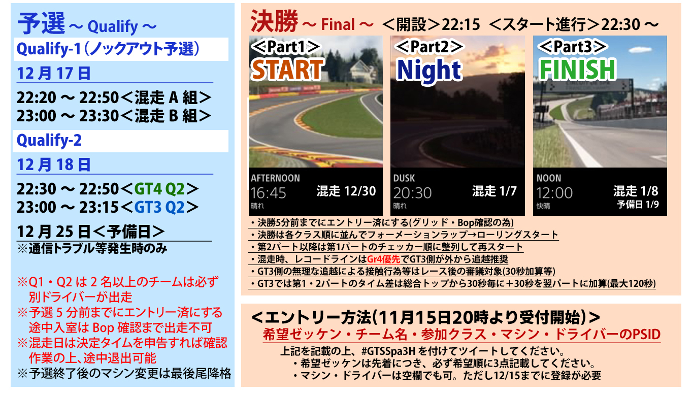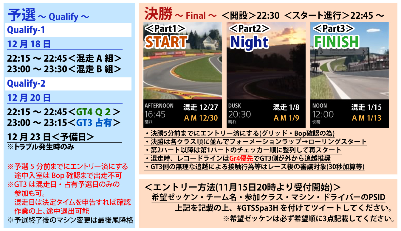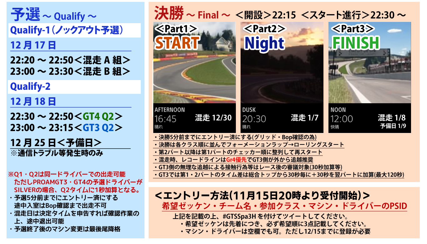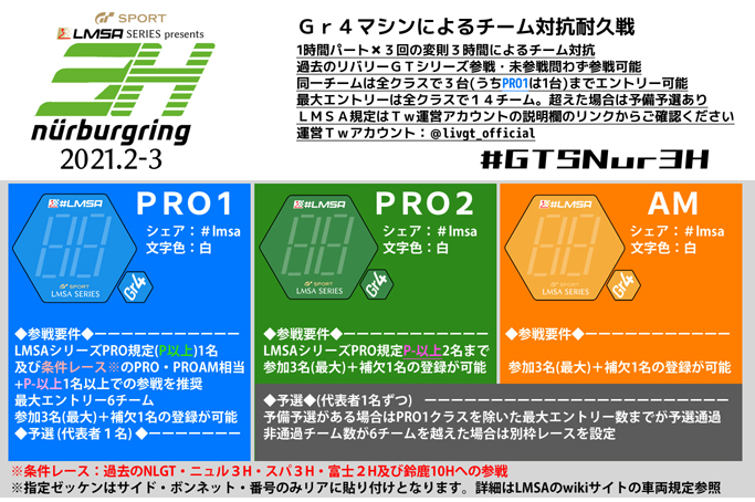 ●エントリー方法は「希望ゼッケン(希望順に3点)」「チーム名」「参加クラス」「マシン」「各ドライバーのPSID」を記載の上、#GTSNur3H を付けてツイートしてください。