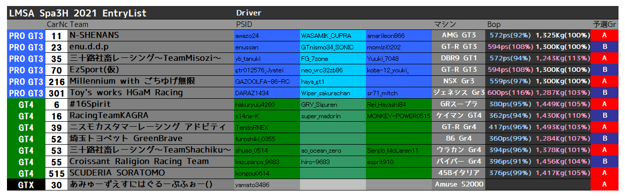 - スパ3H 20-21参戦チームは当該レースでのゼッケン・チーム名をそのままスライドして参戦する事が可能です。ただし、ゼッケンは新規も含め先着順となりますので、お早めにエントリーをお願いします。