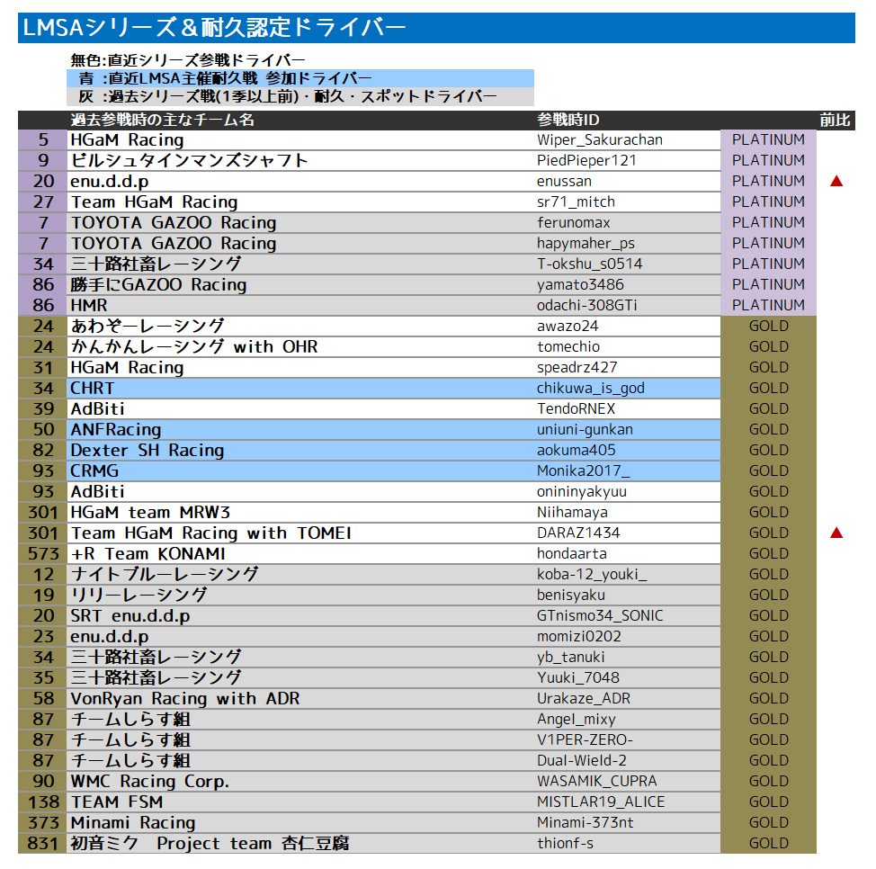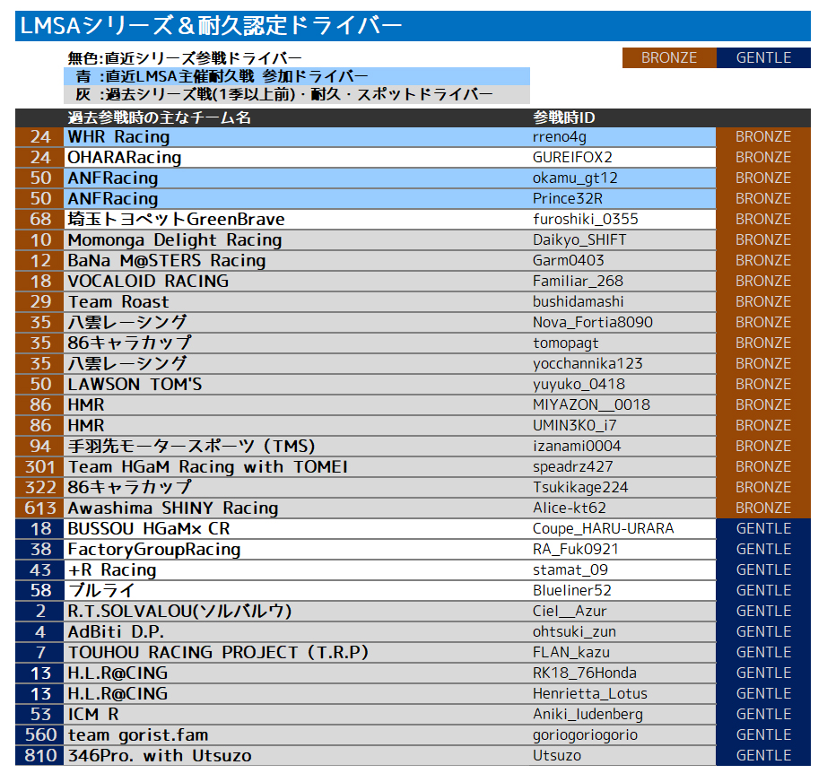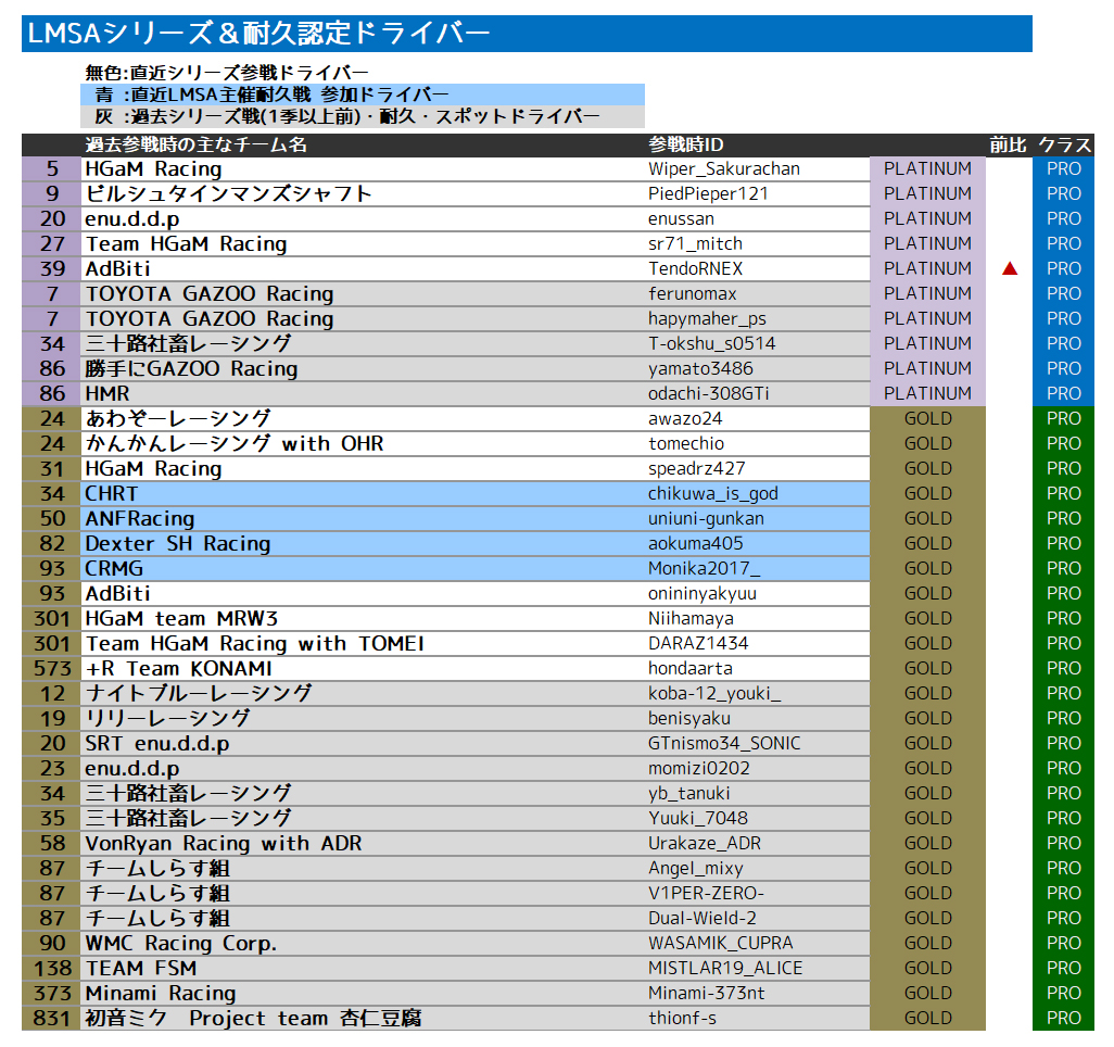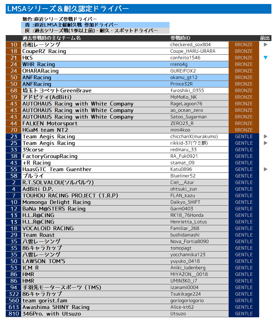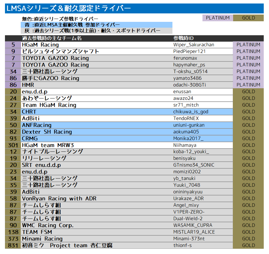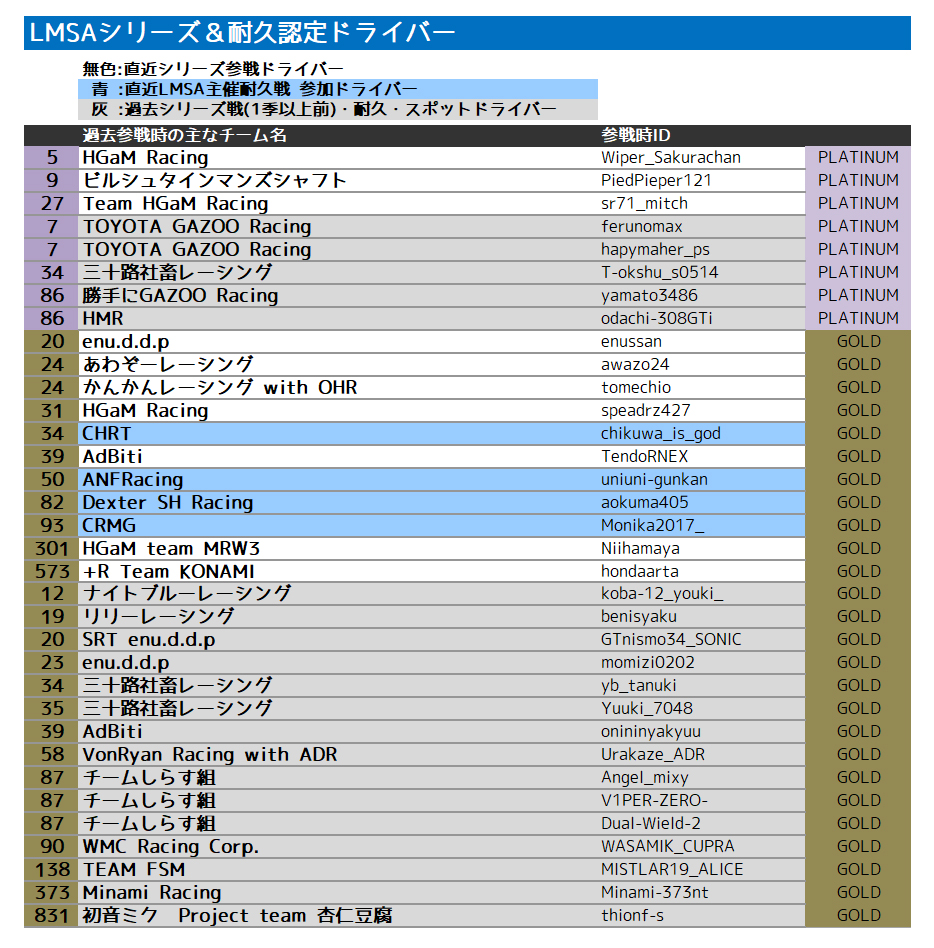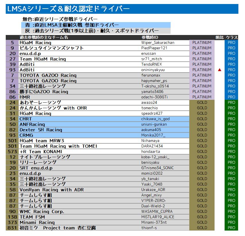 過去のLGTC・NLGTの主催レースイベントにおけるPRO認定相当と、シリーズ・耐久参戦におけるドライバークラス認定を受ける参加者の一覧となります。