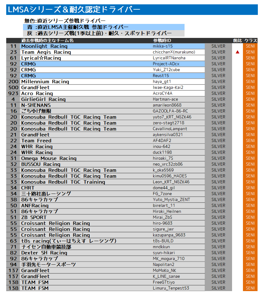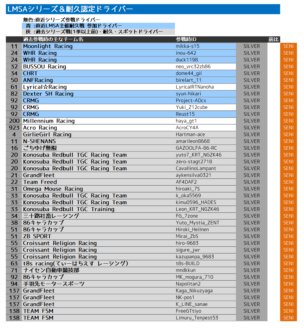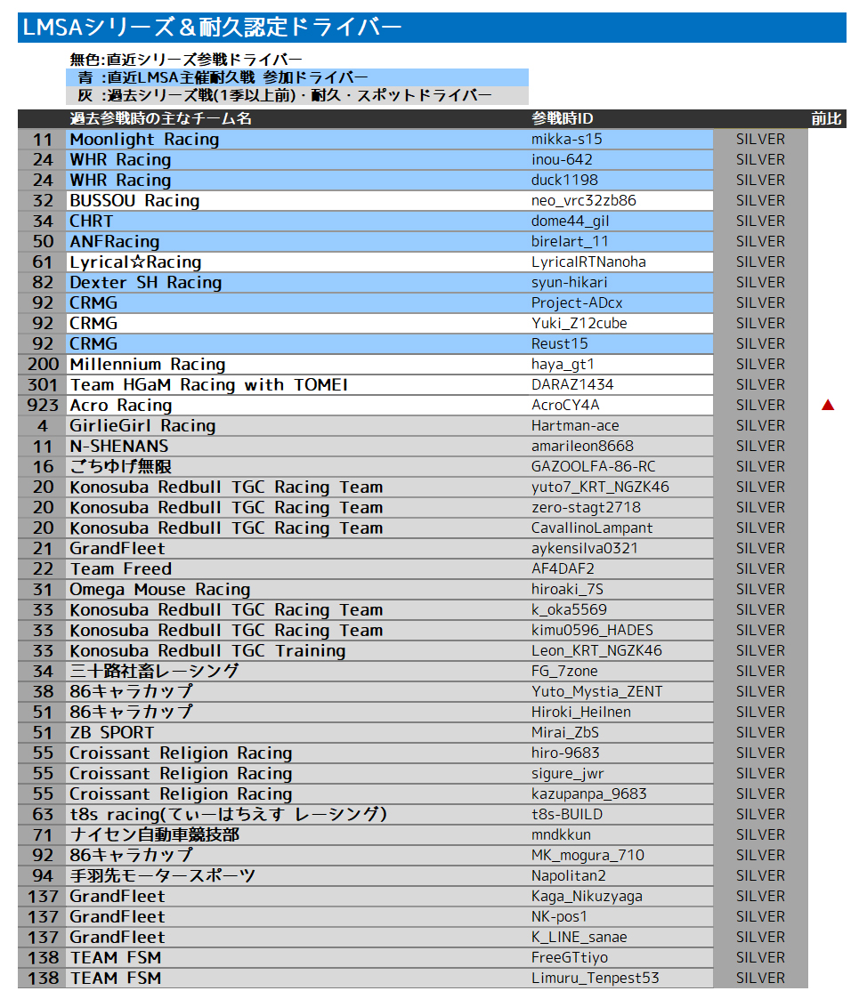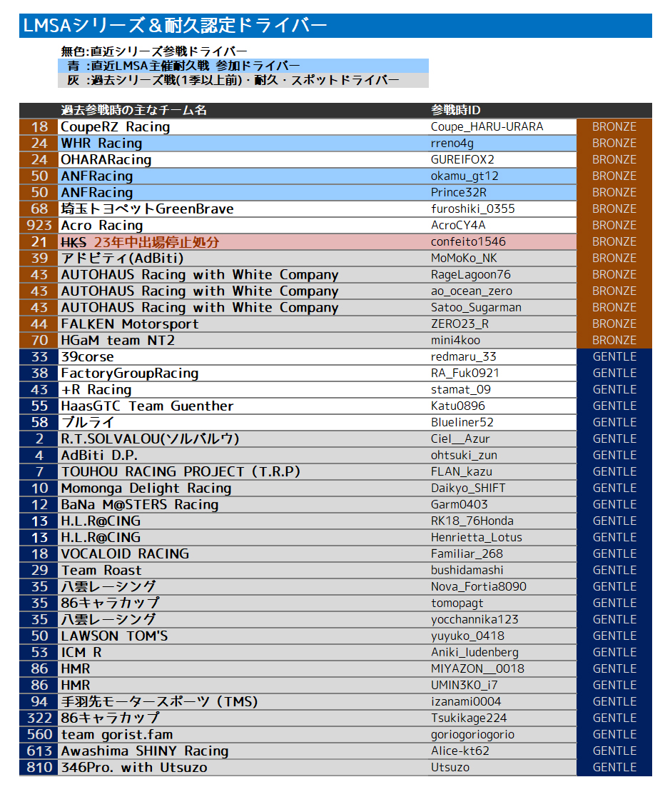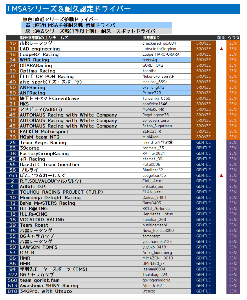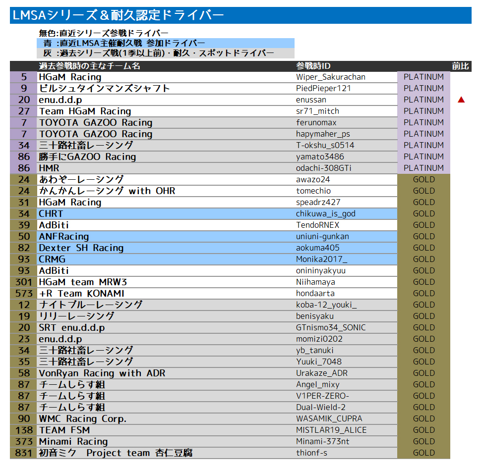 過去のLGTC・NLGTの主催レースイベントにおけるPRO認定相当と、シリーズ・耐久参戦におけるドライバークラス認定を受ける参加者の一覧となります。