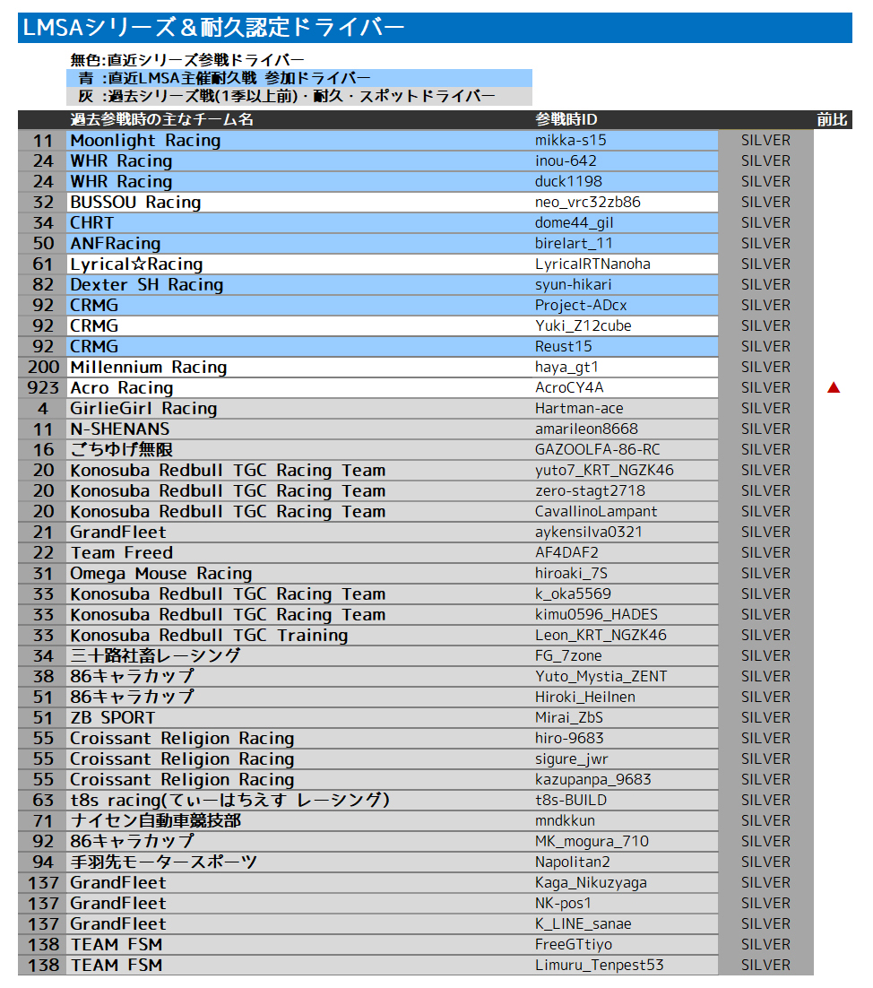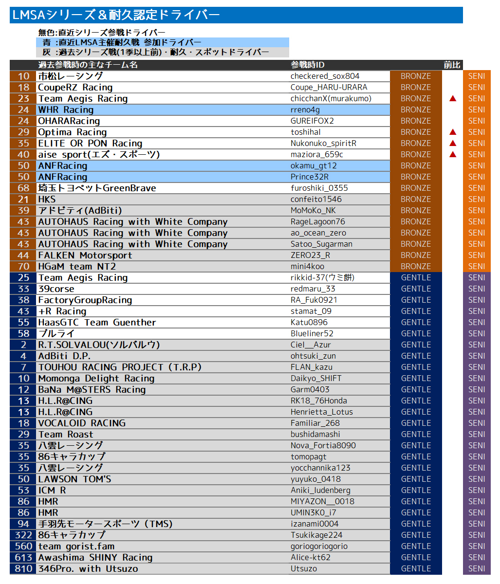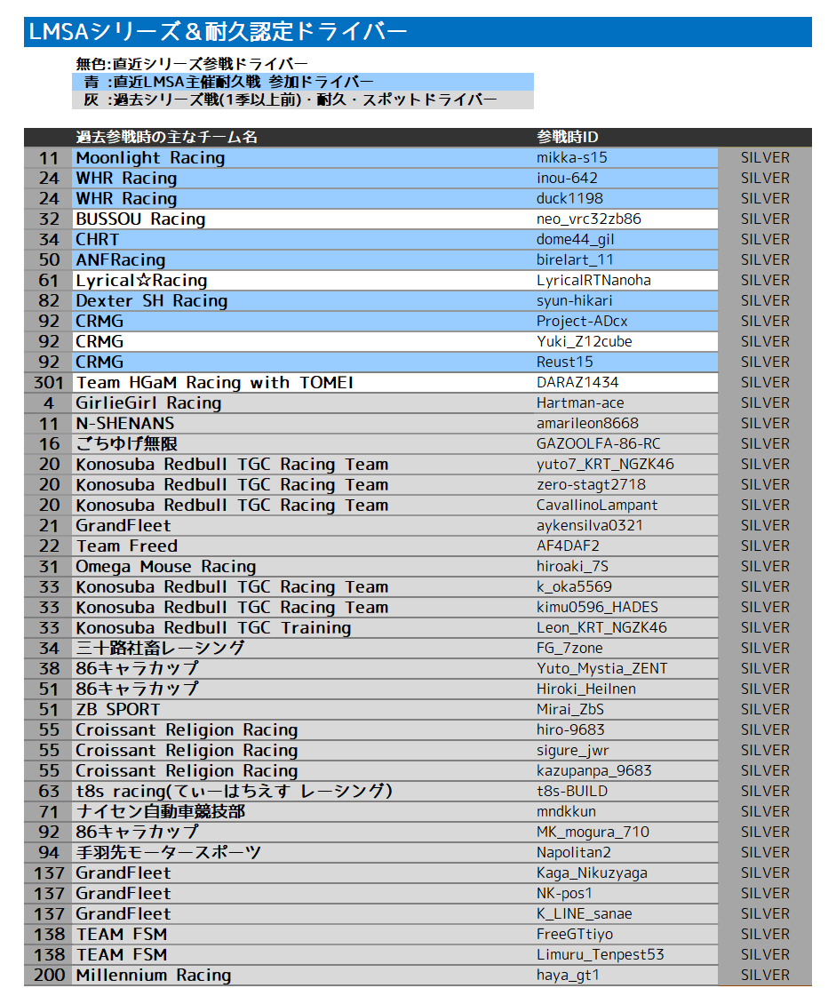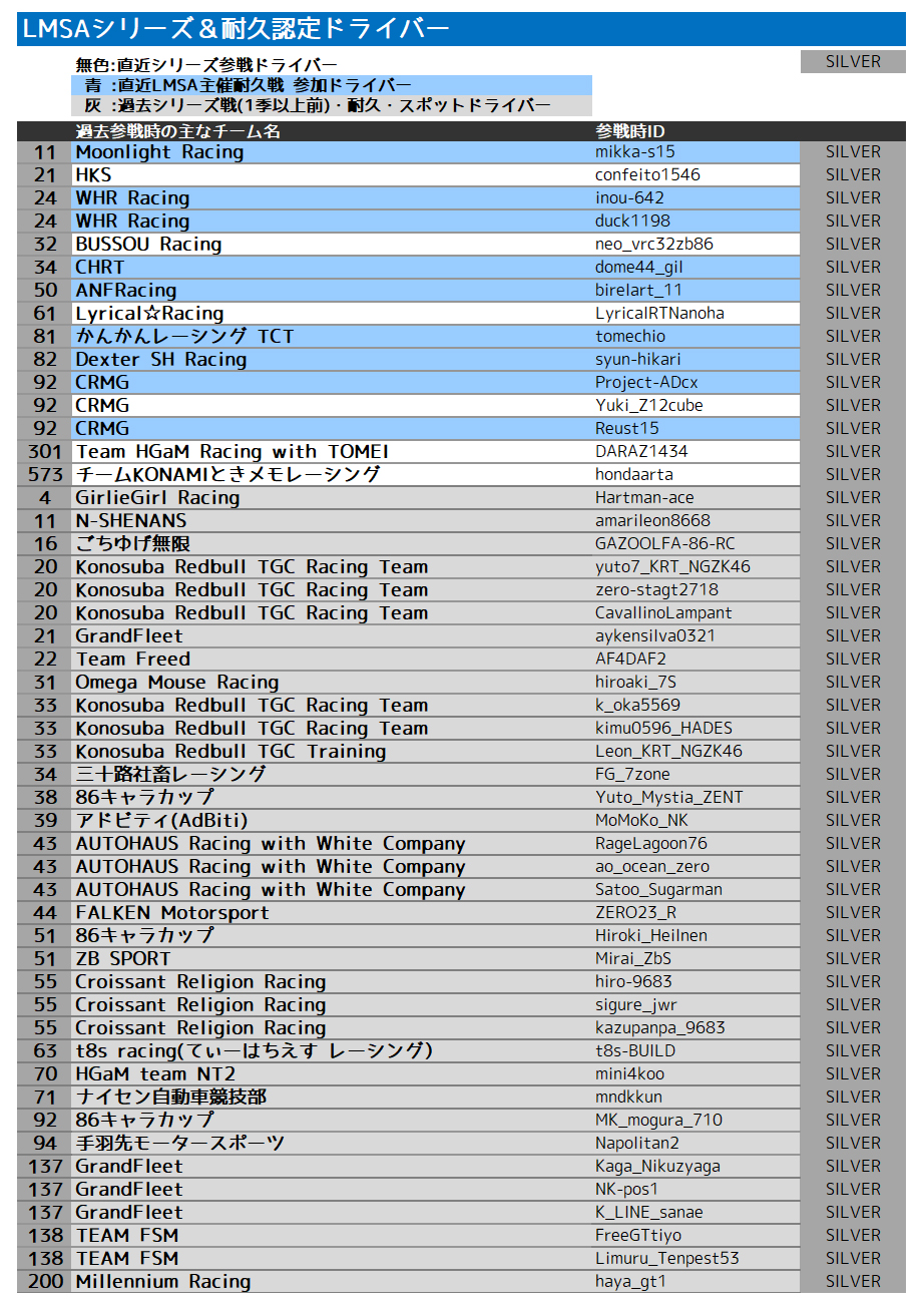 - GTS時代のSILVER認定ドライバーについてはしばらく出場が無ければBRONZE・GENTLEと順に下がる