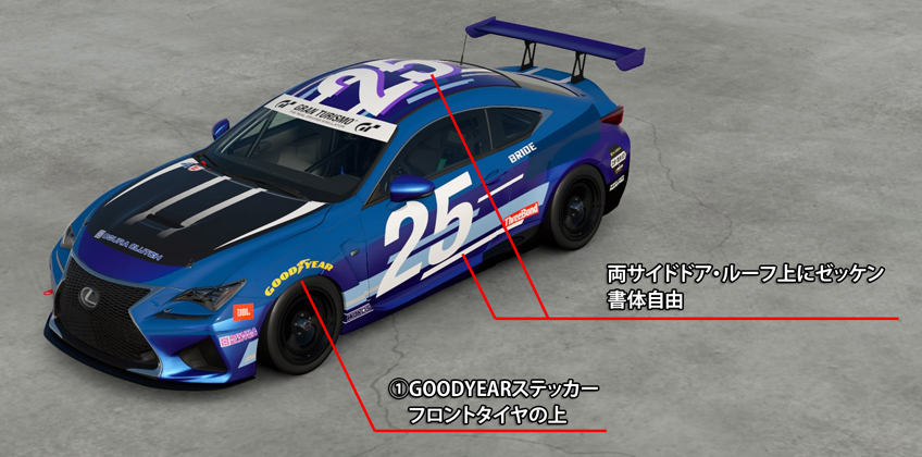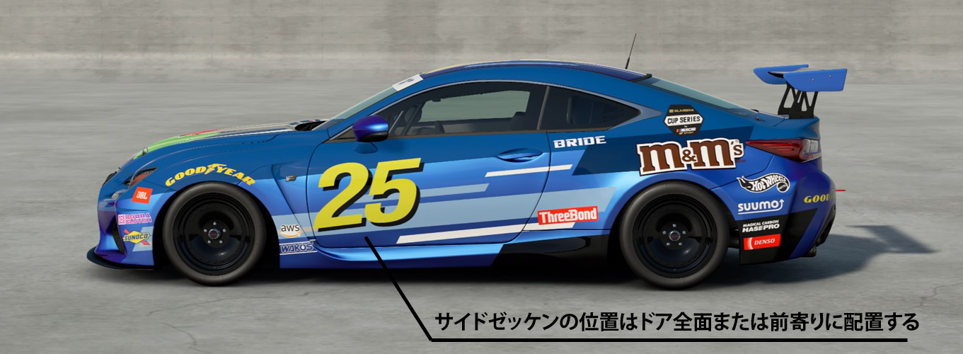 - 両サイドのドア範囲内・ルーフにゼッケン番号(サイズは画像を基準とする)