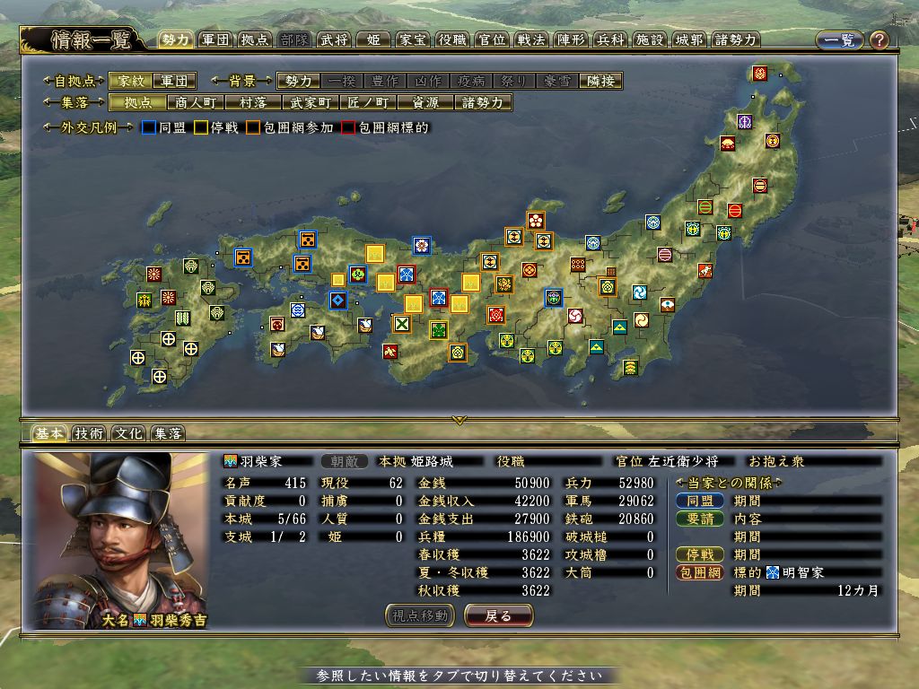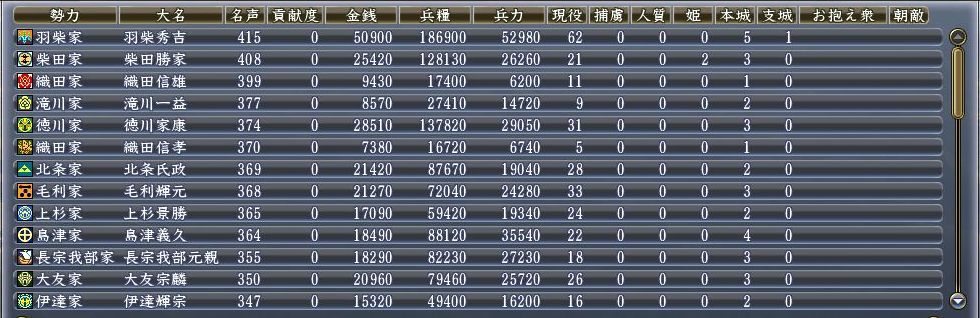 羽柴家が人材・領土ともに一歩抜きんでている。一番きついのは川尻か。